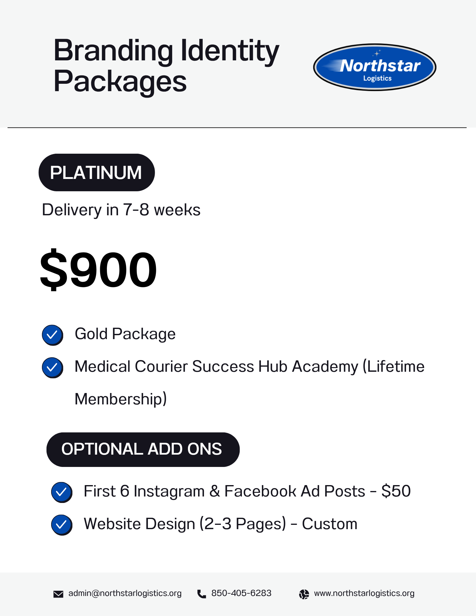 Branding Identity Package from $450.00 30-Minute Courier Consultation $35.00 MEDICAL COURIER CHECKLIST $10.00 STEPS TO BECOME A MEDICAL COURIER $10.00 GUIDE TO CERTIFICATIONS, FUEL & MILEAGE APPS, & TWIC CARD $10.00 100+ STEPS TO BECOME A APPS TO APPLY TO $10.00 COMPLETE PDF BUNDLE $25.00 Become A Medical Courier